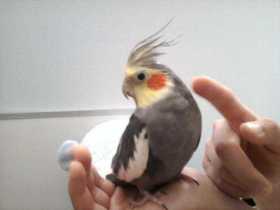 Kirby is grey with white wing tips, orange-red cheeks, and a yellow face. When relaxed, he will respond/sing to cameras or phones.
