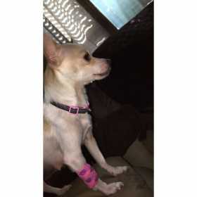 About 5 lbs. White dog with brown. Has a white heart-shaped spot on her forehead.