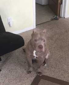 He has clipped ears and a white spot on his chest and back left paw and a dry patch on his tail and front leg